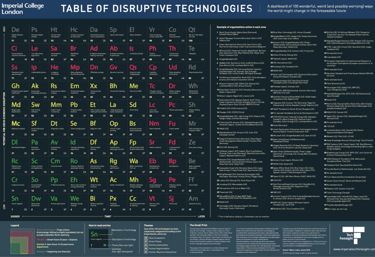 Na busca pela disrupção, instituições como o Imperial Tech Foresight (ITF), do Imperial College de Londres, estão mapeando as inovações que prometem transformar o mundo nas próximas décadas. A "Tabela de Tecnologias Disruptivas", desenvolvida pela equipe do ITF, é uma ferramenta visual que organiza essas inovações em categorias, de acordo com seu potencial de impacto e tempo para se tornarem realidade. Inovações como bactérias programáveis, que podem ser usadas para resolver problemas ambientais, como a poluição plástica, ou a descoberta inesperada de conhecimento, que promete ir além das capacidades humanas, são alguns exemplos de tecnologias que podem moldar o futuro próximo.